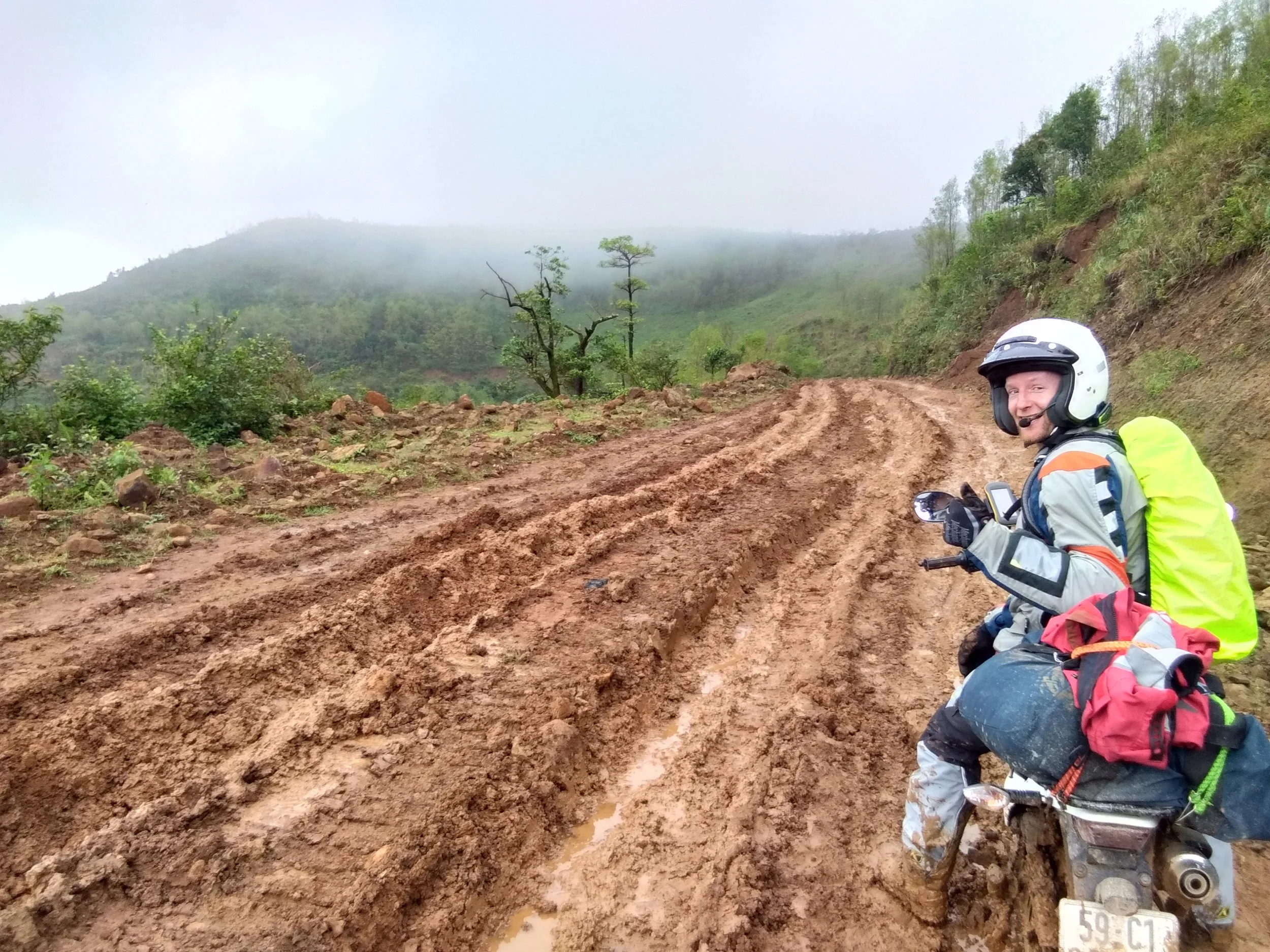 When next we encountered a stretch of muddy ruts, three feet deep, we briefly faltered and paused. But after all, we were on the sort of motorcycles made for this stuff. We watched in bemusment as locals pushed their scooters through the mud in bare feet, then regrouped and re-boarded three-up to continue on their way. In this, the lightweight scooters had the advantage over us.